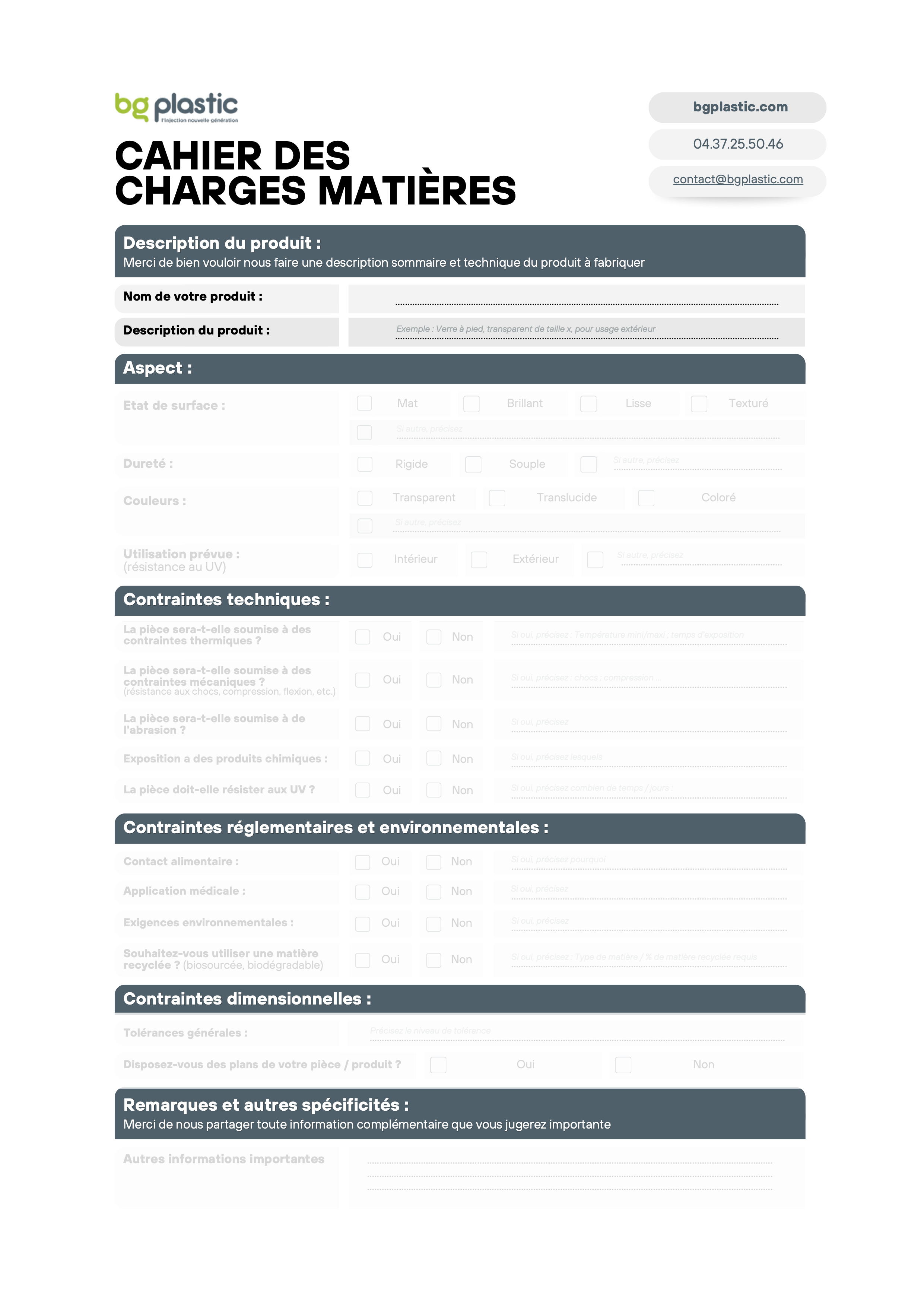 Facilitez la réalisation de votre projet en téléchargeant notre cahier des charges. Il vous guidera dans la description technique de vos besoins en matières plastiques.