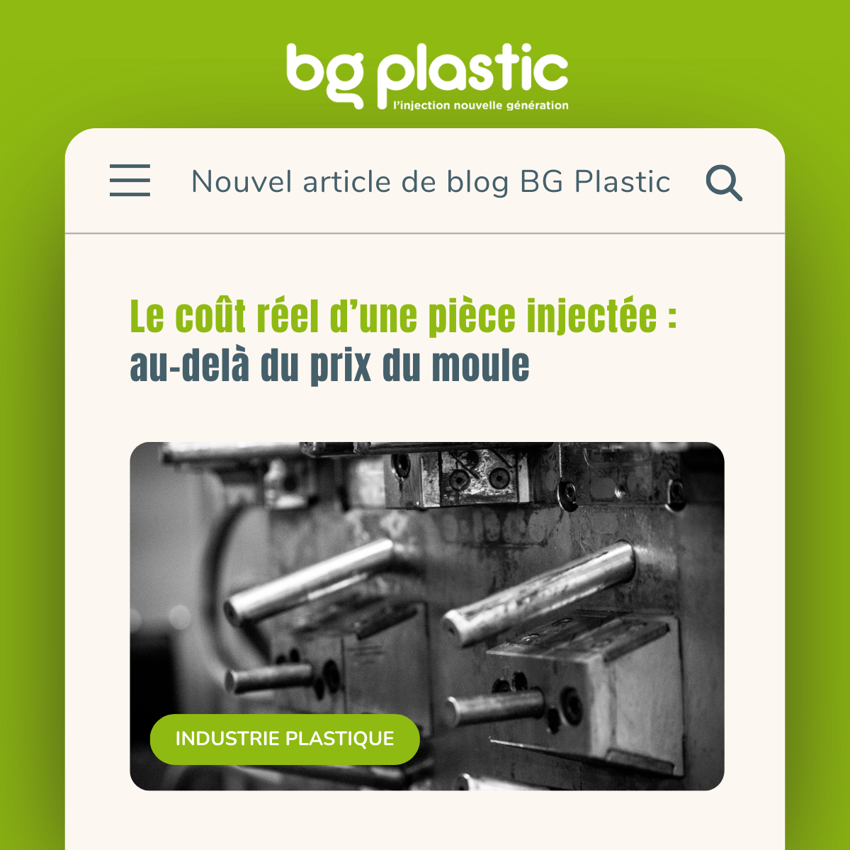 Chez BG Plastic, notre approche « Business » consiste à vous fournir une vision claire de votre TCO. En investissant intelligemment dans la phase d’étude et dans la qualité de l’outillage, vous garantissez un prix de revient compétitif et stable sur toute la durée de vie de votre produit.